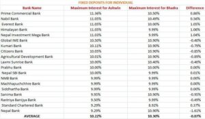 ७ बैंकको ब्याजदर अघिल्लो महिनाको तुलनामा बढेको छ । ४ वटा बैंकले अघिल्लो महिनाकै ब्याजदरलाई निरन्तरता दिएका छन् । सबैभन्दा धेरै ब्याजदर बढाउनेमा हिमालयन बैंक रहेको छ । हिमालयन बैंकको ब्याजदर भदौको तुलनामा असोजमा १.०६% ले बढेर ११.०५% पुगेको छ । व्यक्तिगत मुद्दति निक्षेपमा सबैभन्दा धेरै ब्याजदर प्रइम कमर्सियल बैंकले दिने भएको छ । यस बैंकले ११.३६% ब्याजदर दिने जनाएको छ ।