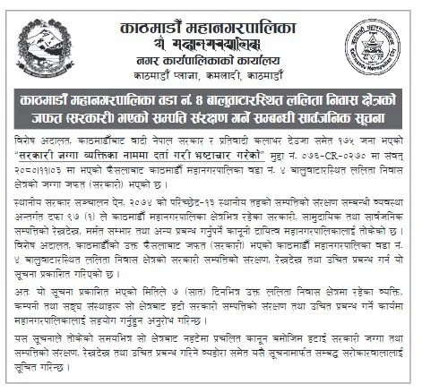 काठमाडौँ महानगरपालिकाले ललिता निवास क्षेत्र एक साताभित्र खाली गर्न आग्रह गर्दै एक सूचना जारी गरेको छ । विशेष अदालतको फैसलासँगै उक्त जग्गा सरकारी भएको भन्दै महानगरले सात दिनभित्र ललिता निवास क्षेत्रमा रहेका व्यक्ति, कम्पनी तथा संघसंस्थाहरूलाई उक्त क्षेत्रबाट हट्न भनेको हो ।