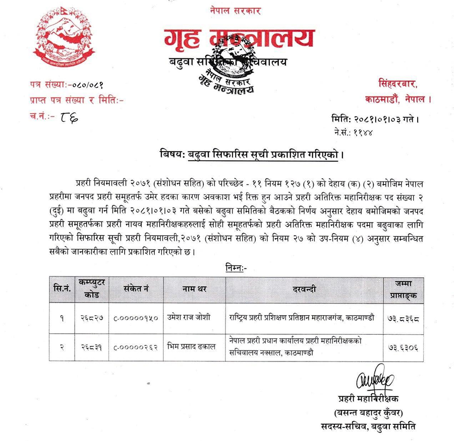 प्रहरी नायव महानिरीक्षक (डीआईजी) उमेश राज जोशी र भिमप्रसाद ढकाल अतिरिक्त महानिरीक्षक (एआईजी) पदमा बढुवा सिफारिसमा परेका छन् ।