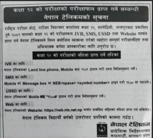 राष्ट्रिय परीक्षा बोर्ड, परीक्षा नियन्त्रण कार्यालयले २०८१ सालमा सञ्चालित परीक्षाको कक्षा १२ को परीक्षाफल सार्वजनिक गर्ने अन्तिम तयारी गरिरहँदा टेलिकमले नतिजा प्राप्त गर्ने सम्बन्धमा जानकारी दिएको हो ।सूचना प्रकाशित गरी नतिजा हेर्ने तरिका सार्वजनिक गरेको हो ।
