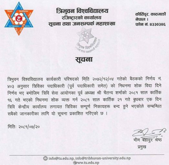 त्रिवि रजिस्ट्रारको कार्यालय, सूचना तथा जनसम्पर्क महाशाखाका प्रमुख भीमबहादुर श्रेष्ठले मंगलबार सूचना निकालेर त्रिवि सेवा आयोगका पूर्वअध्यक्ष चैतन्य शर्माको निधनमा बुधबार शोक बिदा दिने उल्लेख गरेका छन्।