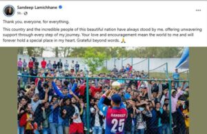 नेपाली क्रिकेटर सन्दीप लामिछानेले सन्यास लिने संकेत गरेका छन् । नेपाली क्रिकेट टिमका लेग स्पिनर समेत रहेका लामिछानेले सामाजिक सञ्जालमा राखेको एक भावुक पोस्टपछि फ्यानहरू त्यस्तो अड्कल गरिरहेका छन्।सन्दीपले सामाजिक सञ्जालमा पोस्ट राख्दै नेपालका समर्थकहरूप्रति कृतज्ञता प्रकट गरेका छन् । उनले लेखेका छन् , सबैजनालाई यो सबै कुराको लागि धन्यवाद ।