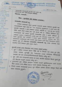 ज्ञापन पत्रमा सुनचाँदी ब्यवसायीले भोग्नु परेका समस्या, ब्यवसाय सुधारका लागि कालिनु पर्ने कदम र राज्यका तर्फवाट आवश्यक सहयोग लगायतका बिषयहरु समेटिएका छन् ।