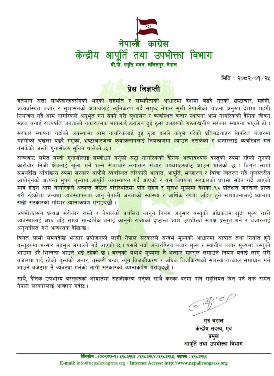 कांग्रेसको आपूर्ति तथा उपभोक्ता विभाग प्रमुख समेत रहेका केन्द्रिय सदस्य गुरु बरालले जारी गरेको विज्ञप्तिमा नेपालीको स्वास्थ्य र आर्थिक रुपमा समेत अहित हुने सम्भावनालाई ध्यानमा राखी नुनको आपूर्ति व्यवस्था अहिलेकै अवस्थामा राख्नुपर्ने भन्दै सरकारको ध्यानाकर्षण गराइएको छ।