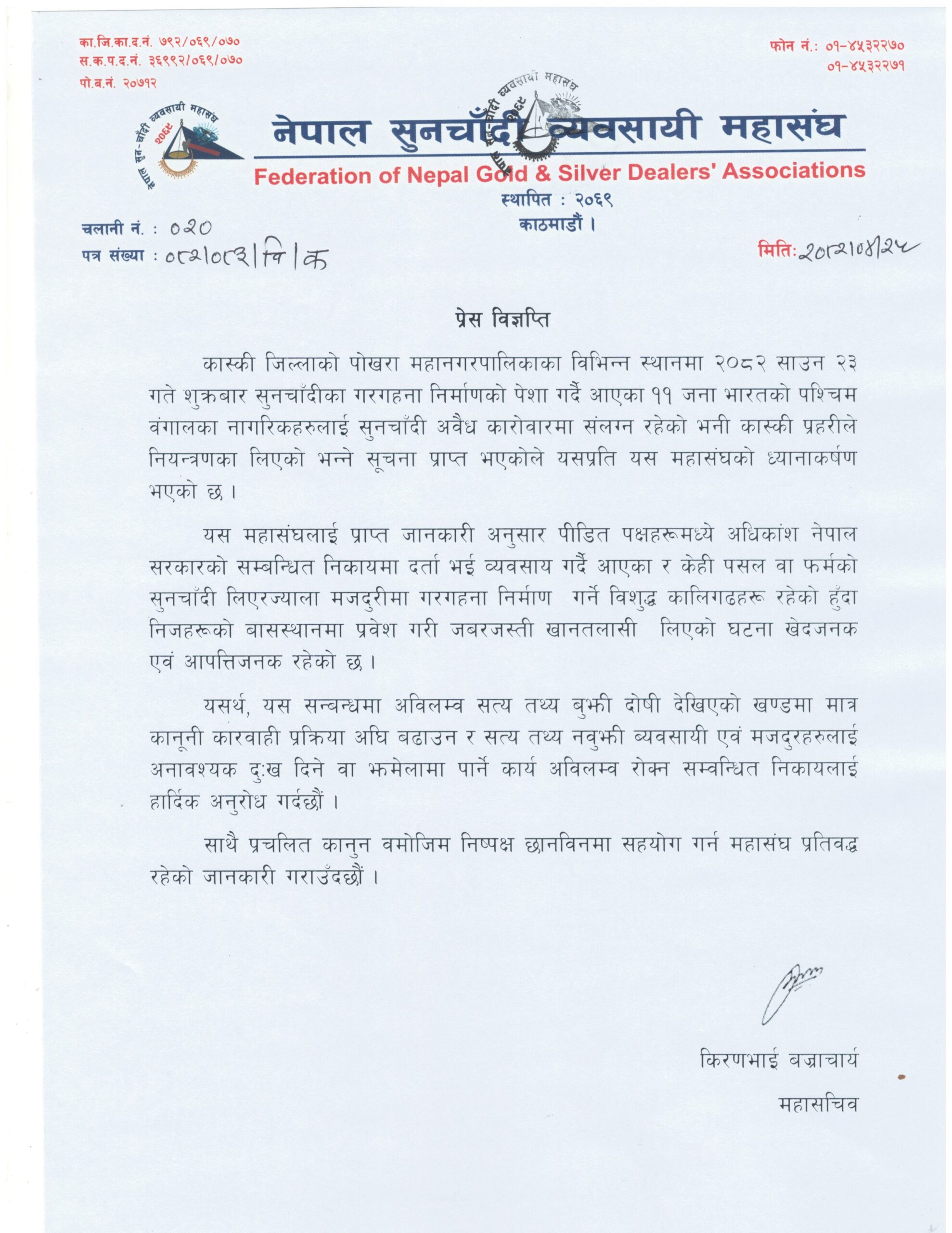 कास्की जिल्लाको पोखरा महानगरपालिकाका विभिन्न स्थानमा २०८२ साउन २३ गते शुक्रबार सुनचाँदीका गरगहना निर्माणको पेशा गर्दै आएका ११ जना भारतको पश्चिम वंगालका नागरिकहरुलाई सुनचाँदी अवैध कारोवारमा संलग्न रहेको भनी कास्की प्रहरीले नियन्त्रणका लिएको भन्ने सूचना प्राप्त भएको प्रति नेपाल सुनचाँदी ब्यवसायी महासंघले आफ्नो ध्यानाकर्षण भएको जनाएको छ । महासंघले आइतबार एक विज्ञप्ति जारी गर्दै सत्य तथ्इ वुझेर मात्र काम गर्न सम्वद्ध निकायसँग आग्रह समेत गरेको छ ।