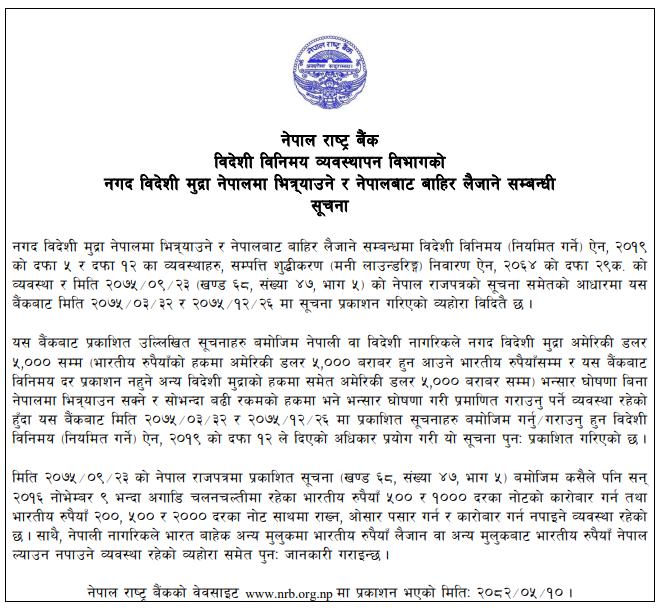 यसअघि नै बैंकले मिति २०७५-०३-३२ र २०७५-१२-२६ मा सूचना प्रकाशित गरिसकेको भए पनि विदेशी विनिमय (नियमित गर्ने) ऐन, २०१९ को दफा १२ अनुसार यसपटक फेरि पुनः प्रकाशन गरिएको हो।