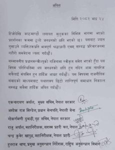 नेपाल सरकारका मुख्यसचिव एकनारायण अर्याल, प्रधान सेनापति अशोकराज सिग्देल, गृह सचिव गोकर्णमणि दुवाडी, सशस्त्र प्रहरी महानिरीक्षक राजु अर्याल, प्रहरी महानिरीक्षक चन्द्रकुवेर खापुङ र राष्ट्रिय अनुसन्धान विभागका प्रमुख हुतराज थापाले संयुक्त रुपमा उक्त अपिल गर्नुभएको हो ।