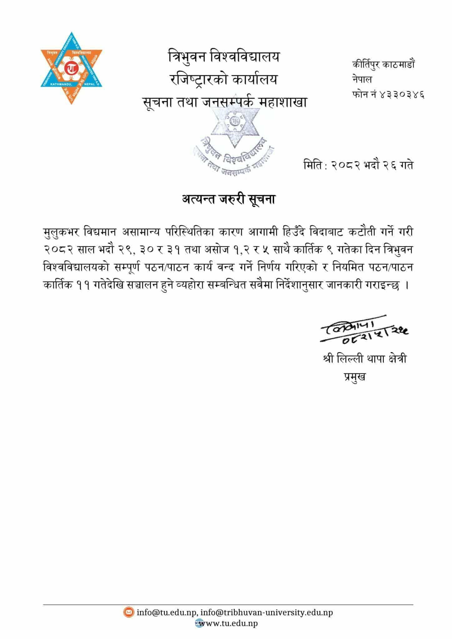 सूचना तथा जनसम्पर्क महाशाखाले आज एक सूचना जारी गर्दै भनेको छ–मुलुकभर विद्यमान असामान्य परिस्थितिका कारण आगामी हिउँदे बिदाबाट कटौती गर्ने गरी २०८२ साल भदौ २९, ३० र ३१ तथा असोज १,२ र ५ साथै कार्तिक ९ गतेका दिन त्रिभुवन विश्वविद्यालयको सम्पूर्ण पठनपाठन कार्य बन्द गर्ने निर्णय गरिएको र नियमित पठन पाठन कार्तिक ११ गतेदेखि सञ्चालन हुने ब्यहोरा सम्बन्धित सवैमा निर्देशानुसार जानकारी गराइन्छ ।