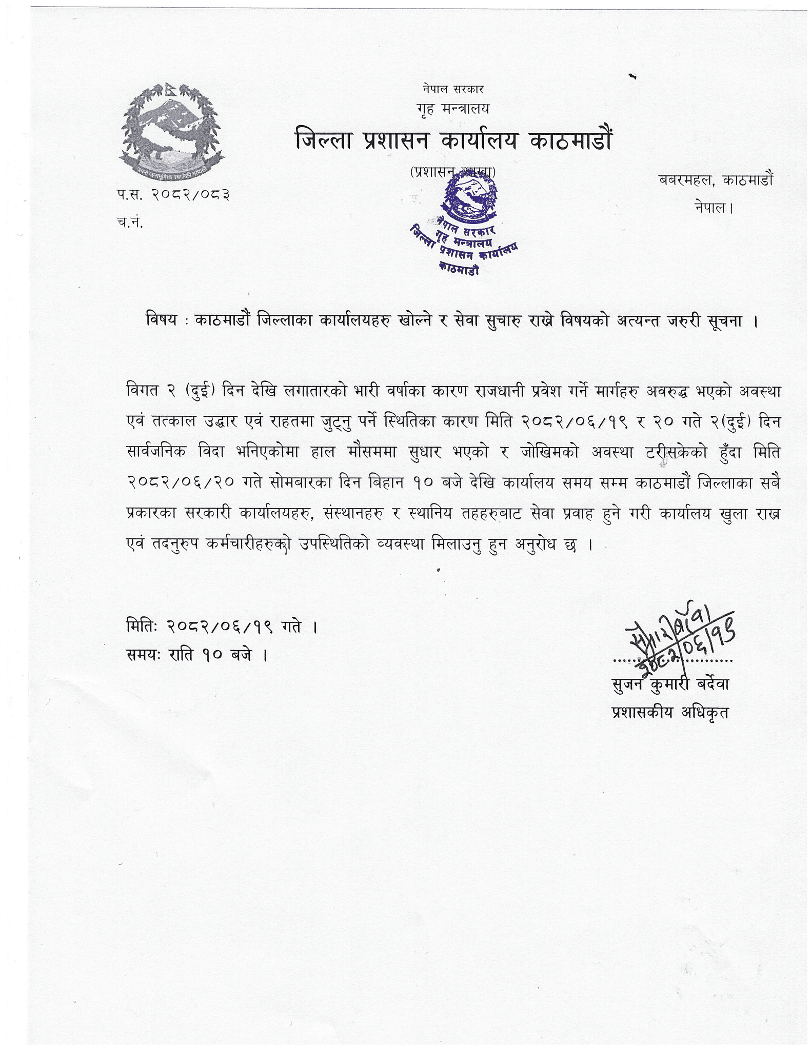 काठमाडौँ प्रशासनले जारी गरेको सूचनामा भनिएको छ, ‘मिति २०८२-०६-२० सोमबार बिहान १० बजे देखि कार्यालय समयसम्म काठमाडौँ जिल्लाका सबै प्रकारका सरकारी कार्यालयहरू, संस्थानहरू र स्थानीय तहहरूबाट सेवा प्रवाह हुने गरी कार्यालय खुला राख्न तथा कर्मचारीहरूको उपस्थितिको व्यवस्था मिलाउन अनुरोध गरिएको छ।’