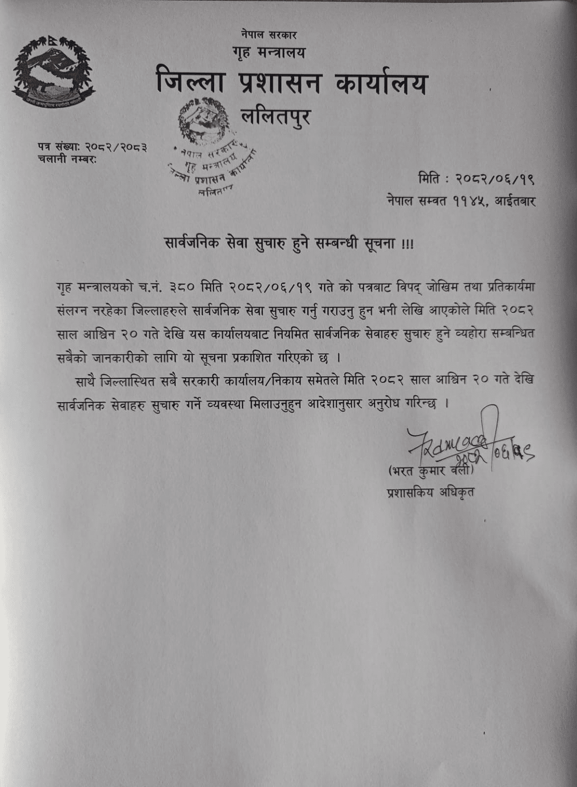 यस्तै, ललितपुर प्रशासनले पनि गृह मन्त्रालयको निर्देशनअनुसार सोमबारदेखि सबै सार्वजनिक सेवा नियमित रूपमा सञ्चालन हुने जनाएको छ।