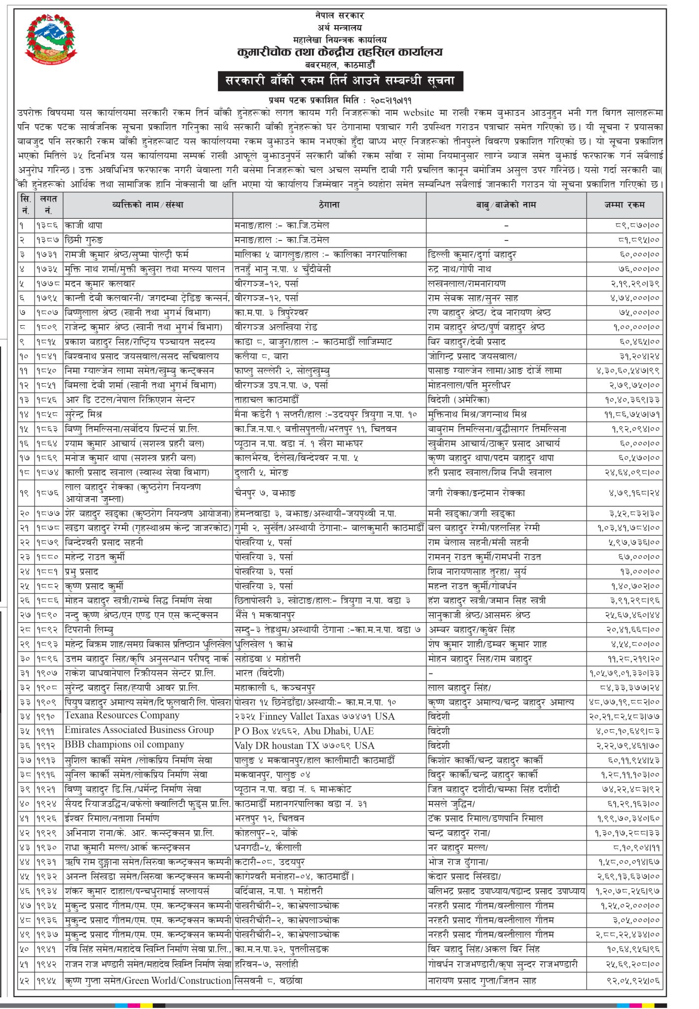 सरकारले सरकारलाई तिर्नुपर्ने रकम नतिरेका ५२ जनाको तीनपुस्ते विवरण सार्वजनिक गरेको छ ।