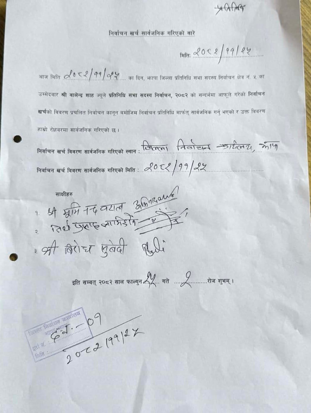 शाह फागुन २१ गते भएको निर्वाचनमाझापा–५ बाट अत्यधिक मतले विजयी भएका थिए । प्रतिनिधिसभा सदस्य निर्वाचन ऐन २०७४ अनुसार उनले निर्वाचन कार्यालय झापामा सोमबार खर्च विवरण बुझाएका हुन् ।